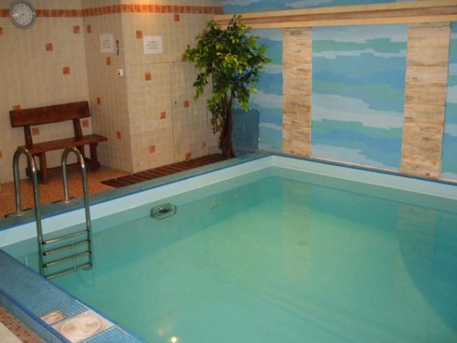 (1 nedidelis 25 m2 baseinas šalia pirties, baseine yra masažinė srovė ir kaskada.)